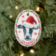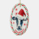 This cute Holiday ornament makes a fun gift for anyone! The front features a black and white cow wearing a red and white Santa hat. Around the cow portrait are ornate red snowflakes. At the bottom is custom text that currently says "Cowabunga!" The image is framed with a pretty red, green, and white candy cane stripe pattern. The back of the ornament has the same striped frame, and several text fields for you to customize.