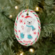 This cute Holiday ornament makes a fun gift for a child, especially a daughter, son, granddaughter,or grandson, or niece or nephew. On the front, a little white polar bear wears a red Santa hat, blue winter scarf, and blue ice skates. He carries a red and white striped candy cane. The image is framed with a pretty red, green, and white candy cane stripe pattern. The back of the ornament has the same striped frame, and several text fields for you to customize.