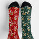 Christmas socks with a pattern of gingerbread man cookies in Santa outfits and candy canes on a red background.