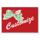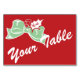 Decorate your Holiday or Christmas party with these customizable, retro style table cards featuring white writing, a green bow with holly berries and leaf accent on a red background.