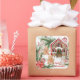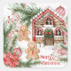 This design features watercolor illustrations of candy cane house, gingerbread boy and gingerbread girl, poinsettia, spruce branchlets and Christmas baubles
