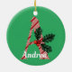 Festive holiday design features candy cane striped letter A with added holly and customizable text to add name or monogram on green background.