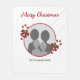 Festive round photo template design featuring Destei's original illustration of two red and white striped Christmas candy cane treats decorated with a red bow and a Christmas holly / Common holly plant. The photo is framed by a red color border. There are also two personalizable text areas.