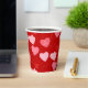 A pattern of ubiquitous candy conversation hearts reading “Love You”, “Be Mine”, "Kiss Me", "XOXO" and “Hug” in red, rose, and pink cascading over a Valentine red background