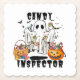 This image is a Halloween-themed design featuring a ghost in the center, with the words "CANDY INSPECTOR" written in bold black letters below. The ghost is depicted with a friendly, cartoonish expression and is surrounded by various candy-themed elements, including lollipops, candy canes, and candy corn. On either side of the ghost are two jack-o-lanterns, each with a different expression. The jack-o-lanterns are filled with colorful candy, adding to the festive and playful atmosphere of the design. The background is transparent. Overall, the image is a whimsical and cheerful representation of the Halloween holiday, with a focus on the sweet treats that are often associated with the occasion.