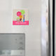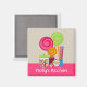 A kitchen magnet featuring an illustration of a jar of gumballs, three lollipops, stick candy, a piece of chocolate, and a cupcake. Personalize with your name.