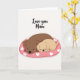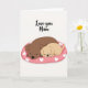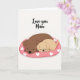 This greeting card shows two stylized dog-like figures cuddled close in the center, their rounded bodies pressed together in a calm embrace that reads like quiet friendship and love ❤️. A larger chocolate-brown figure wraps its front limbs around a smaller fawn-colored companion, and both wear closed eyes with tiny, content smiles and a faint pink blush on their cheeks. They rest on an oval cushion in rose-pink, creating a cozy little “nest” that makes the hug feel protected and gentle. The cushion is patterned with crisp white hearts and a sprinkling of small white dots, adding a soft, affectionate rhythm to the scene 🌼. The background stays plain white, keeping all attention on the pair and their tender, unhurried closeness. Near the top, the words “Love you Mum” appear in black, set above the illustration and centered so the message feels directly connected to the cuddle below. The two figures have simple black noses and minimal features, reinforcing the sweet, peaceful mood without extra decoration. The rose-pink oval cushion beneath them is filled with white heart shapes and tiny dot accents.