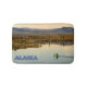 Alone in the wilderness. A canoe plies the mirror-still water of lake in the interior of Alaska. In the distance typical taiga and mountains. Text reading "Alaska" also appears. This image is derived from a United States Fish and Wildlife Service photograph.