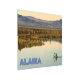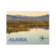 A canoe plies the mirror-still water of lake in the interior of Alaska. In the distance typical taiga and mountains. Text reading "Alaska" also appears. This image is derived from a United States Fish and Wildlife Service photograph.