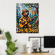 This imaginative artwork showcases a bear, a true "Canopy Crooner," with a firefighter helmet and sunglasses, captivatingly playing an acoustic guitar while perched securely on a branch within a lush forest. A jar of honey dangles nearby. The vibrant, textured impasto creates a powerful and whimsical atmosphere, making this "Love My Honey" scene truly unforgettable.