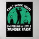 This humorous golf-themed illustration features a distressed green circle resembling a golf green, within which a black silhouette of a golfer is mid-swing and a golf bag is visible. A golf ball and a flag are on the green, with the background of the shirt being black. The text "CAN'T WORK TODAY" curves across the top in white, while "I'M FEELING A LITTLE UNDER PAR" is displayed below in white, with a green distressed banner accenting "UNDER PAR." The design plays on the golf term "under par" to humorously explain a desire to avoid work.