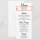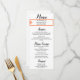 Personalized Menu options on front in black text against crisp white background. The Bride and Groom's Names and Wedding Date are highlighted in pretty cantaloupe color frame. Backside has simple Monogram initials in cantaloupe text. Original Designs © TamiraZDesigns.