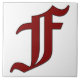 The letter F in Canterbury style done in red on a white background with a slight shadow to give it a three dimensional effect.