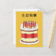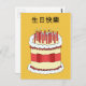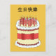 A large pastel colored birthday cake with several lit candles on top, against a golden colored background. The image has 'Happy Birthday' in Cantonese written above the cake.