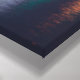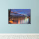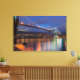 Canvas wall art shown with an art print of a lit bridge over inlet of water with fir tree and a city lit up on a hill.
