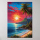 Escape to a world of vibrant enchantment with a captivating digital art poster. As the sun kisses the horizon, the sky transforms into a mesmerizing canvas of crimson and gold hues. The beach becomes a front-row seat to this tropical spectacle, where the waves dance in the fading light. This poster captures the allure of a crimson sunset, inviting you to immerse yourself in the beauty of paradise.