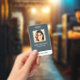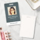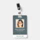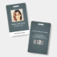Modern photo business ID identification card with barcode over a blue-gray canvas background. Additional information can be added to the backside of this business ID badge