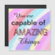A colorful message of motivation to display with inspiring words You Are Capable of Amazing Things upon a rainbow patterned diagonal stripe backdrop of bright lilac, coral, yellow, blue and white.