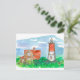 A post card featuring Nauset Lighthouse on Cape Cod, Massachusetts with bright red roof and rambling purple wildflowers illustrated with ink and watercolor.