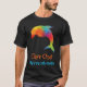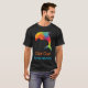 My 11 yo wore adult XL (5’7” 165#). The 8yo is small framed. She wore adult small and tied it in the back. Grandma wore adult large with long sleeve shirt underneath. Tall girl adult medium. Dark haired male adult large. Good quality dark Heather gray, Gildan brand shirt. -it was next up from basic choice and cost about $20 per shirt. Not too thick or thin. Washed and dried well, no major shrinkage. Not see-through. Can wear a bra under it fine. Screen print is just as shown and well done, front and back.