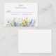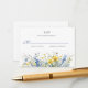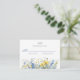 A floral wedding reply card with watercolor illustrations of small sunflowers, blue forget-me-nots and eucalyptus.