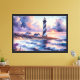 A serene coastal scene captures the iconic Cape Hatteras Lighthouse standing tall against a glowing sunset sky, wrapped in its signature black and white spiral. Soft waves roll toward the shore, their crests kissed by the light of dusk, while dramatic purples and pinks infuse the clouds with a moody, romantic energy. The buildings nestled nearby hint at quiet history and maritime life, lending an inviting, nostalgic touch. This piece uses a watercolor-inspired digital style to create a dreamlike mood, perfect for lovers of nautical charm and tranquil seascapes. Ideal for coastal-themed rooms, beach houses, or as a calming accent in any space. The horizon’s warm glow and the textured sea evoke peace, wanderlust, and reflection. AI generated artwork.