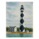 This stunning watercolor captures the distinctive beauty of the Cape Lookout Lighthouse, a true jewel of the North Carolina coast. Its iconic black and white diamond pattern stands boldly against a serene, cloud-streaked sky, a guiding light for mariners for generations. In the foreground, the tranquil blue-green waters reflect the light, inviting contemplation. Nestled on the sandy shore beside the towering beacon are the charming keeper's quarters, a historic white house with a welcoming porch, and a smaller outbuilding, all framed by a distant line of verdant trees. This piece perfectly embodies the remote charm and enduring spirit of Cape Lookout National Seashore.