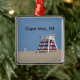 A lifeguard chair on the beach of Cape May with the lighthouse in the background.