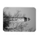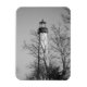 This is a black and white photo of the Cape May Lighthouse. Known to locals as Cape May Light, it is located in southern New Jersey in Cape May Point State Park. The lighthouse is at the very tip of South Jersey and serves as a beacon to incoming ships. This scenic photo was taken in winter, and the lighthouse can be seen through the bare branches of trees in the foreground. The lighthouse is a NJ landmark, a Cape May tourist attraction, and a beautiful piece of architecture.