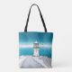 An illustration of the lighthouse at Cape Reinga in New Zealand, the lighthouse is drawn and black and white and is lighting up a blue sky period. Native New Zealand flax is stand a long the track to the lighthouse.