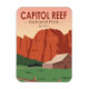 Capitol Reef vector artwork design. The park surrounds a long wrinkle in the earth known as the Waterpocket Fold, with layers of golden sandstone, canyons and striking rock formations.