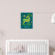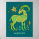 Poster in a stylized depiction of a goat, intricately decorated with patterns of green and yellow, representing the zodiac sign Capricorn. Surrounding elements include celestial symbols and leafy designs.