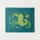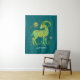 Tapestry in a stylized depiction of a goat, intricately decorated with patterns of green and yellow, representing the zodiac sign Capricorn. Surrounding elements include celestial symbols and leafy designs.