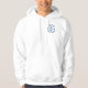 White hoodie featuring a dark blue nautical anchor surrounded by a rope border. Across the anchor is a light blue ribbon with your boat's name. Add title, for example captain, at the top and a custom name at the bottom.