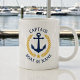 A Personalized giant 20-ounce coffee Mug with Captain rank or other title, your boat name, family name or other desired text. Featuring a custom designed nautical boat anchor, gold style laurel leaves and star emblem. Makes a great gift for any occasion.