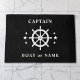 Personalize your boat, home, office or beach house with a nautical themed area rug with the "Captain" and your name, boat name or other desired text. This striking rug features a custom designed ships helm wheel complimented with stars and rich styled typography in white on a regal black base. The design also allows you to easily edit and customize the base and text colors as needed to match your current decor. Available in several sizes with options for indoor or outdoor use.