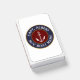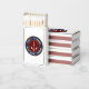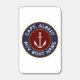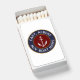 Personalized Captain with your name and boat name nautical anchor logo matchboxes. Navy blue and maroon classic circle emblem with white anchor, text and gold boarders on a white background.