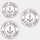 Personalized Captain with your name and boat name nautical anchor logo waterproof labels. White circle emblem with navy blue anchor and text with maroon boarders.