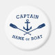 Stylish round refrigerator magnet with your personalized captain or other rank, your name or boat name or desired text and a custom nautical anchor and crossed oars in navy blue on white or choose background color to match your decor. Makes a great unique gift.