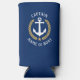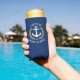 A Personalized Tall Can Cooler with Captain or other title and your boat name, family name or other desired text. Featuring a custom designed nautical boat anchor, gold style laurel leaves and star emblem on navy blue or easily change the base color as desired. Makes a great gift for any occasion.