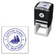Captain with your name schooner sailboat logo self inking stamp. Classic round emblem with your name and boat name fields in block text and with schooner sailboat at center.