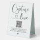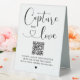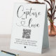Invite guests to share their photos with this modern heart script Capture the Love wedding QR code sign. Elegant flowing calligraphy with a signature heart flourish headlines the design, with a customizable QR code below so guests can easily scan and upload their pictures. A sweet heart accent completes the look. Fully customizable with your own QR code and text.