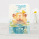 This delightful capybara greeting card features a cute capybara floating in water with a cheerful yellow bird perched on its head. Surrounded by lily pads and gentle water ripples, the capybara's content expression adds a charming touch to the scene. Rendered in a soft watercolor style, this card is ideal for nature lovers and those who appreciate whimsical animal art. Perfect for any occasion, this card celebrates friendship and tranquility, making it a unique and heartwarming gift for capybara fans and animal lovers alike.