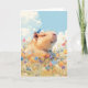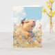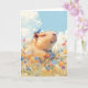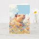 This whimsical greeting card showcases a peaceful capybara enjoying a sunny day in a colorful flower-filled meadow, with a small blue bird perched playfully on its head. The capybara’s relaxed expression and the vibrant blooms create a scene filled with joy and tranquility, perfect for bringing a smile to anyone's day. Ideal for animal lovers and fans of nature-inspired art, this charming card is suitable for birthdays, thank you notes, or simply to spread happiness. Its gentle colors and serene theme make it a delightful addition to any occasion.
