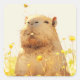 A delightful capybara enjoys a peaceful moment surrounded by a golden field of wildflowers. The warm sunlight highlights the soft texture of its fur, while a tiny butterfly flutters nearby, adding a whimsical touch to the serene scene. The capybara’s content expression and slightly tilted head create a sense of relaxation and harmony with nature. The dreamy, painterly style enhances the warm and cozy atmosphere, making this design perfect for nature lovers and capybara enthusiasts alike.