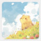 A cute capybara sits calmly on a lush, flower-filled hillside, gazing at the sky with an endearing expression. The background features a bright blue sky with fluffy clouds, while vibrant wildflowers in shades of yellow, red, and white bloom all around. The soft, painterly style creates a dreamy and whimsical atmosphere, perfect for capybara lovers and nature enthusiasts alike.
