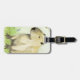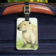A watercolor painting of a Capybara sitting amongst blue flowers in the spring adorns this customizable luggage tag!