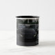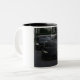 The mug's design features a monochromatic image of two black luxury cars on a city street.
