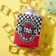 A fun Car Racing theme with a checkered flag pattern and a masculine design for a man's birthday party. Add the name and age to this red and black design with a car lover's dream design.