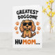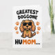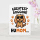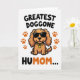 This card shows a caramel-colored, humanlike dog sitting front and center on a white background, shaded with soft brown tones that give it a cozy look ❤️. Its long, wavy floppy ears drape down beside a relaxed face, and its tail curls slightly as if it’s quietly pleased to be near someone it adores. Dark sunglasses add a confident, flirty edge, like it’s posing for a favorite person who can’t help but smile back. Around its neck is a shiny gold chain collar with a small square tag that catches the eye like a little keepsake. Curved text frames the character, with “GREATEST DOGGONE” arched across the top in black and “HUMOM...” placed below in orange, the dots trailing off like an affectionate pause. The warm orange lettering echoes the paw marks nearby, giving the whole layout a friendly, close-to-you feel 🌼. Three orange paw prints sit along the left side and three along the right, spaced around the dog to create an easy, balanced rhythm. The paw prints are a rich autumn orange, each one made of a rounded pad and four small toe marks.